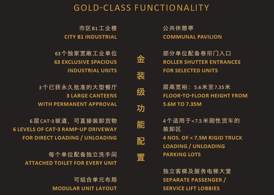 Purpose-Built for Modern Business Operational Excellence CT Gold B1 industrial features 63 industrial units and 3 large restaurants/canteens with flexible, combinable layouts. Each unit boasts generous ceiling heights of 5.6m to 7.35m and private washrooms. Logistics are streamlined with a 6-storey ramp-up system accommodating rigid trucks up to 7.5m in length.