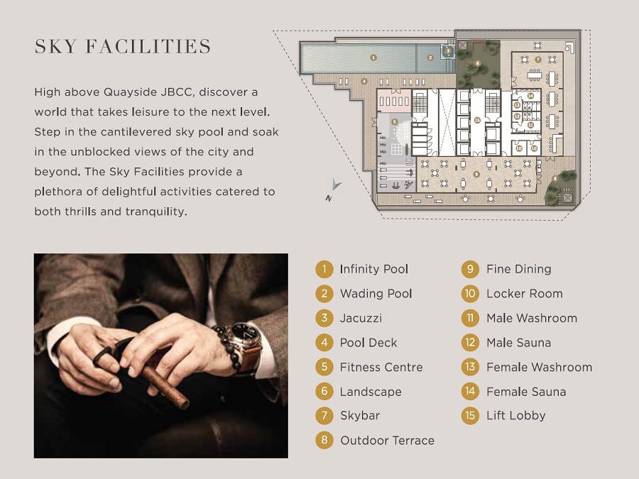 Quayside JBCC will set a benchmark standard above other serviced residences and become one of the most iconic buildings in Malaysia and Singapore by featuring Malaysia's first cantilever sky pool, which is about 30 meters in length.