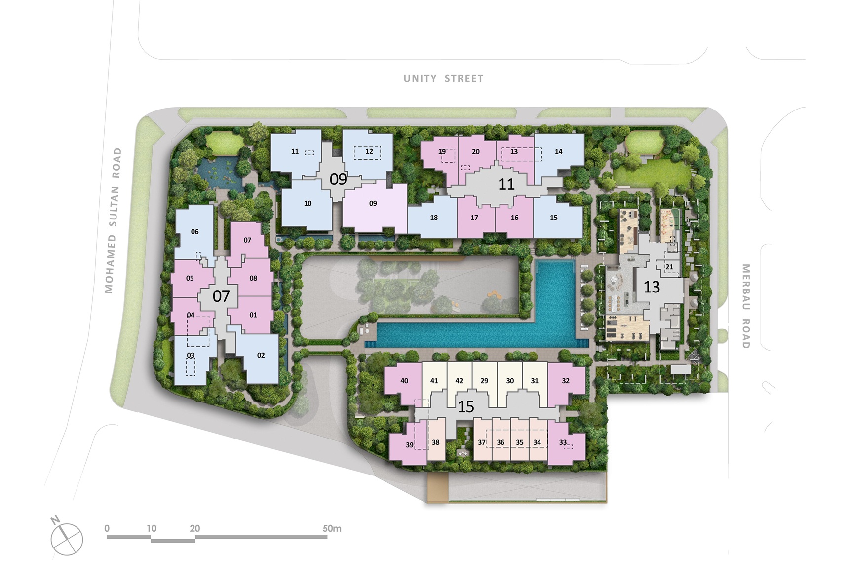 The Robertson Opus is thoughtfully designed to provide a seamless blend of luxury and practicality. The development feature 348 luxury residential units alongside 4,293 sqm of retail space, offering views of the Singapore river and city skyline. The site plan is optimized to include expansive landscaping, creating a tranquil oasis amidst urban convenience.